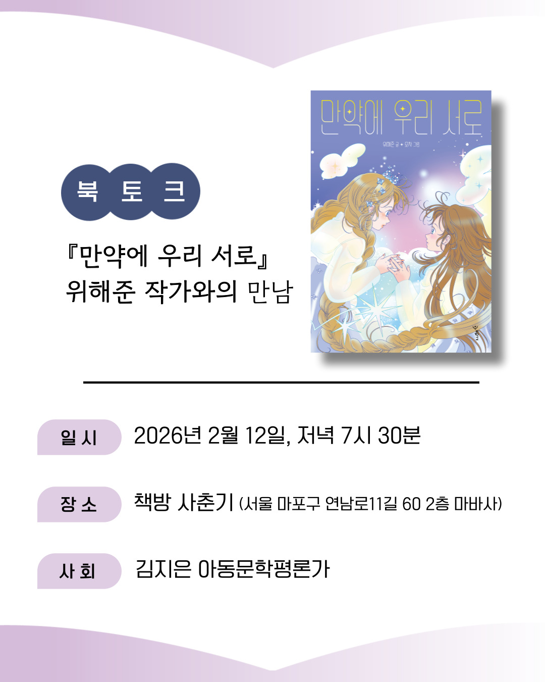 "19세기 독자들에게 『왕자와 거지』가 있었다면, 21세기 우리 독자들에게는 『만약에 우리 서로』가 있다." 김지은 평론가 강력 추천작 『만약에 우리 서로』 출간을 기념하여 작가와의 만남 시간 마련했습니다. 많은 관심과 신청 바랍니다.